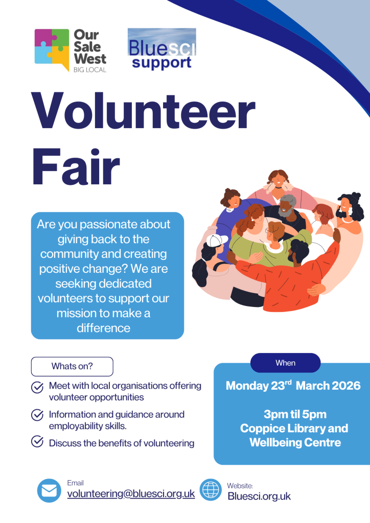 BlueSci is excited to announce our upcoming Volunteer Fair, taking place on Monday 23 March 2026, from 3pm to 5pm at the Coppice Library and Wellbeing Centre. Run in collaboration with our partners Our Sale West, this event is the perfect opportunity for anyone interested in giving back to the community, learning new skills, or exploring how volunteering can support personal growth and wellbeing.